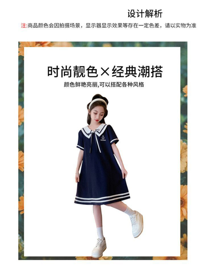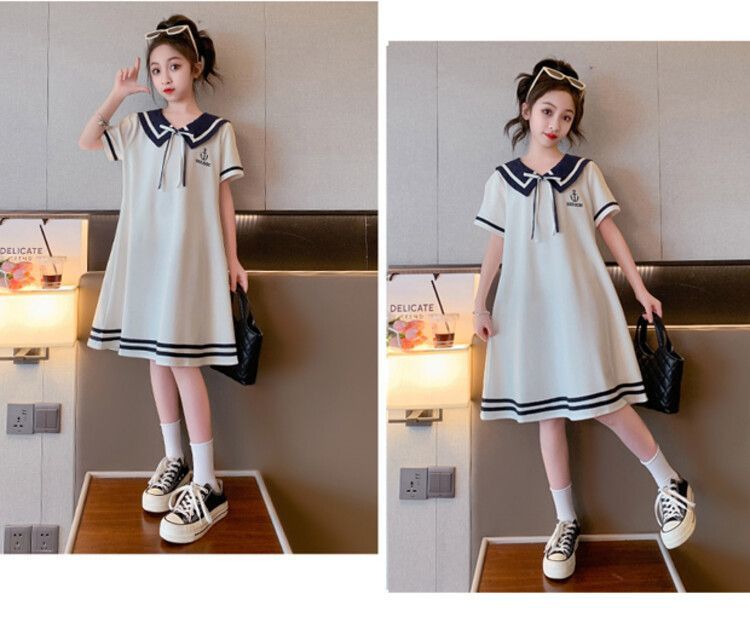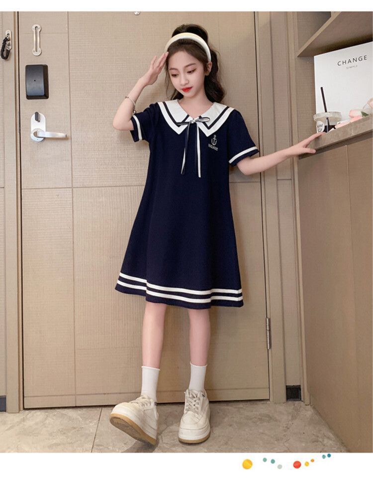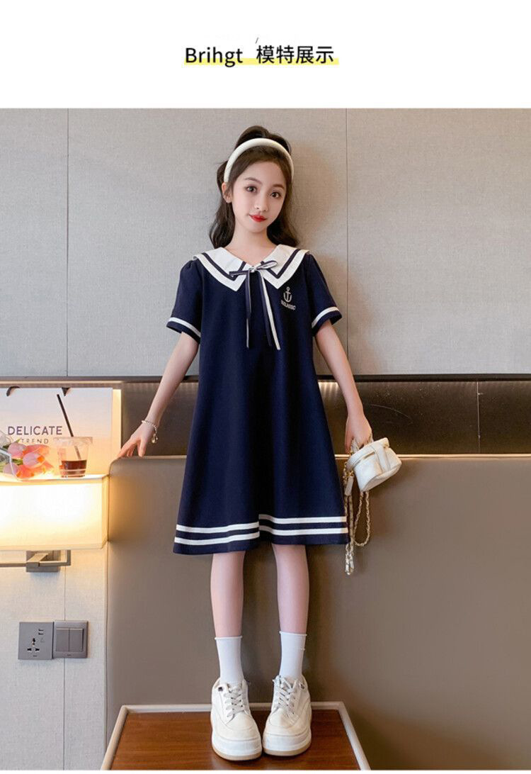 소녀 스커트 여름 2024 새로운 스타일 소녀 큰 어린이 의류 서양식 슬리밍 대학 스타일 해군 칼라 학생 원피스