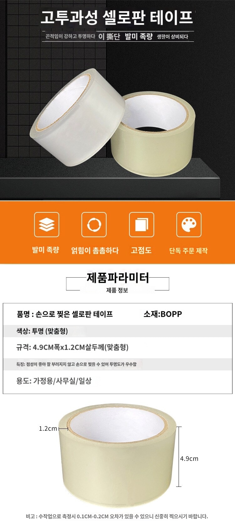 투명 테이프 칼없이 손으로 찢을 수 있는 테이프 다기능 대형 테이프 학생 사무실 밀봉 폭 5cm 두께