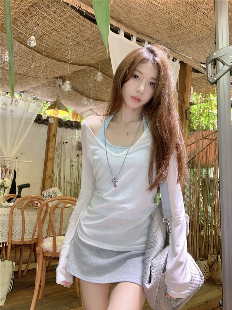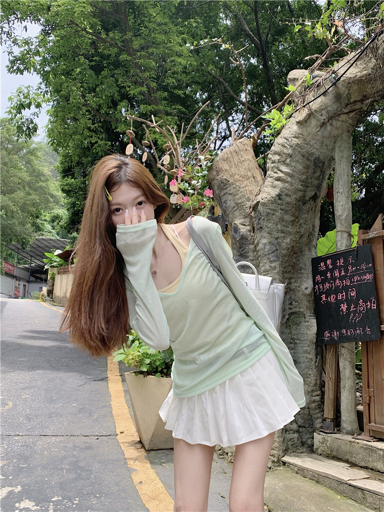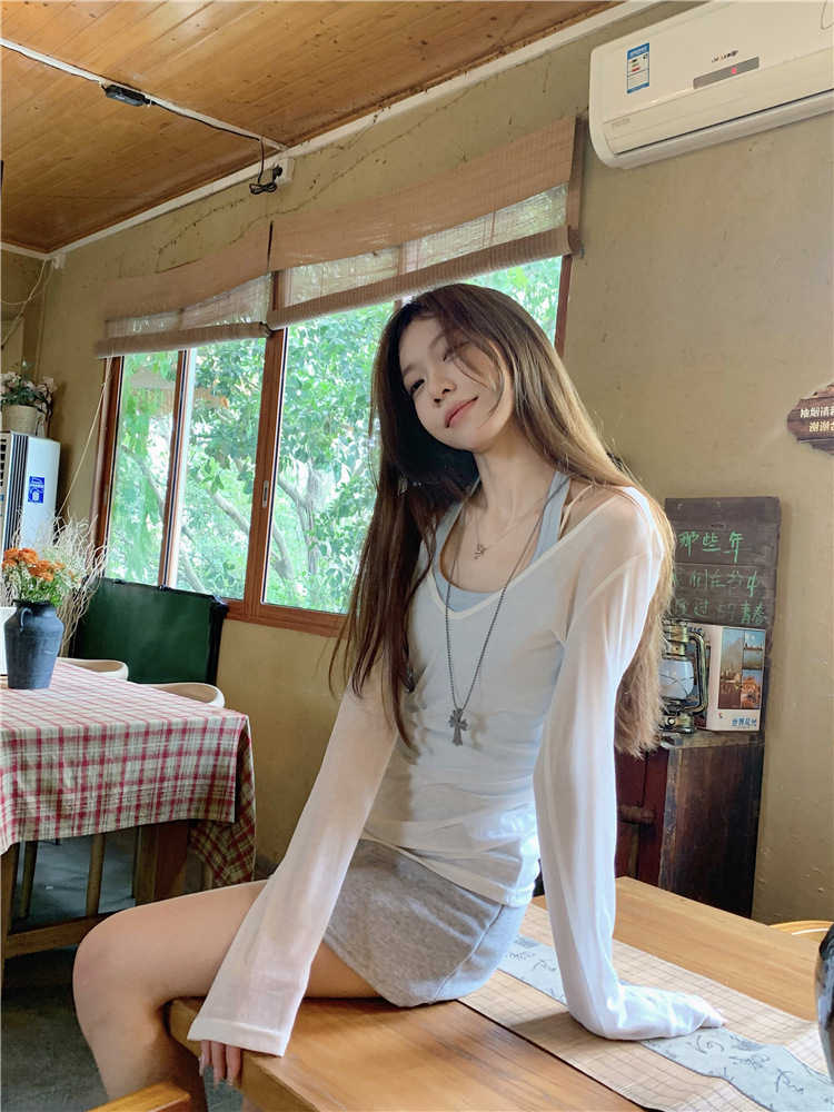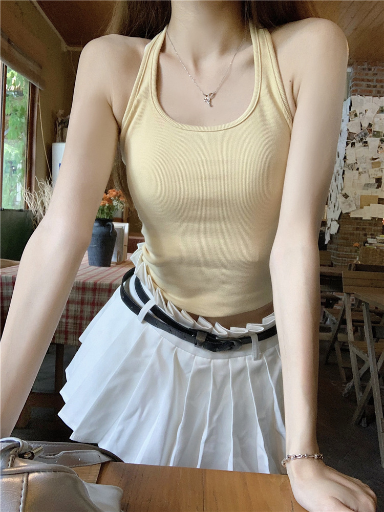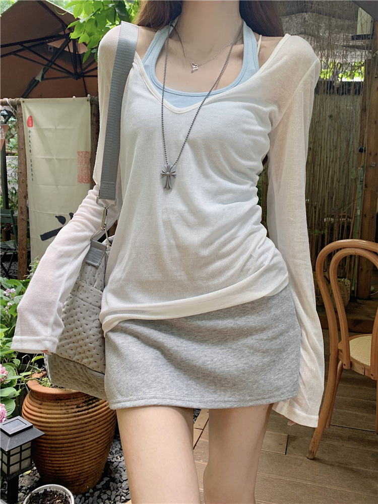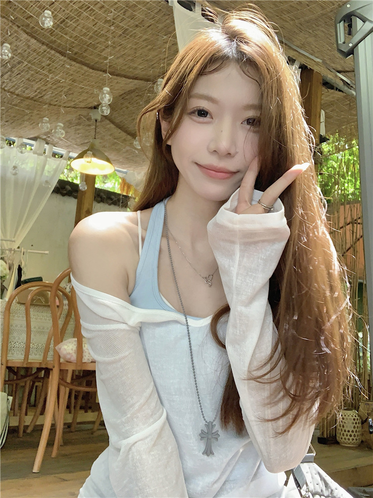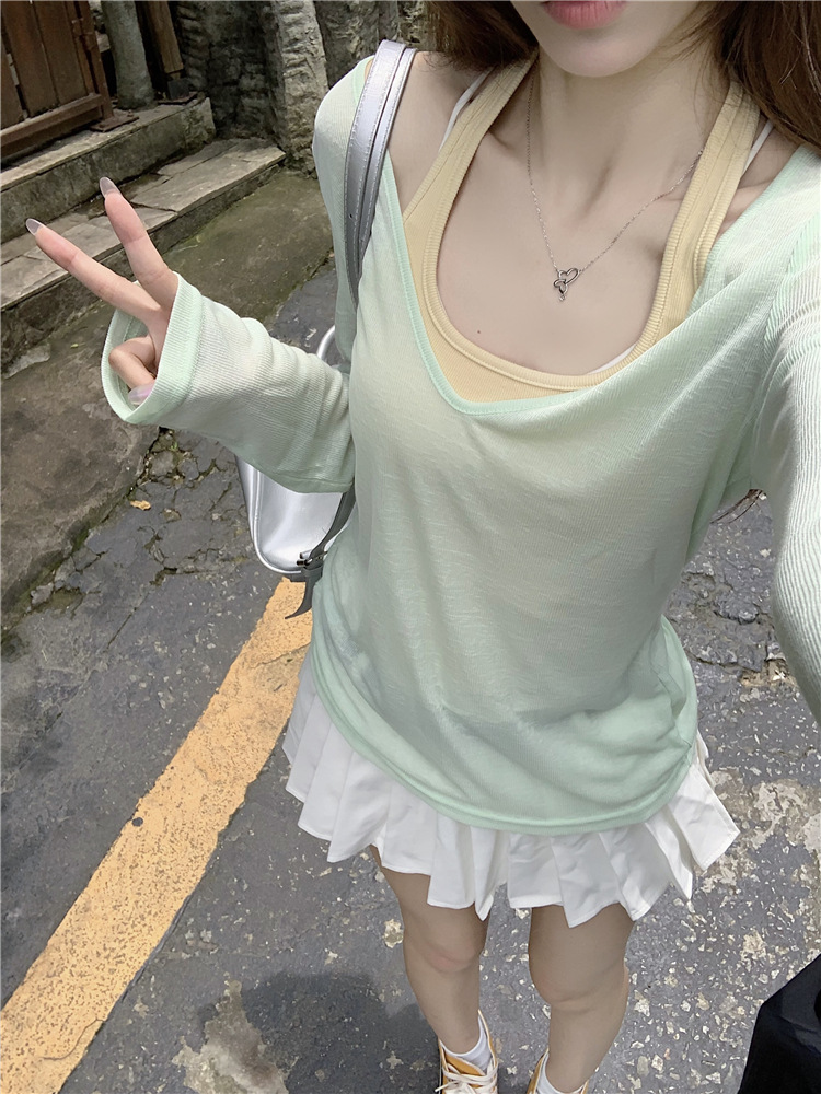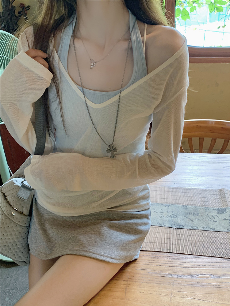 [셀프 세트 공장 오리지널 패브릭] 쌓인 자외선 차단제 블라우스 티셔츠 투피스 순수 백리스 넥 조끼